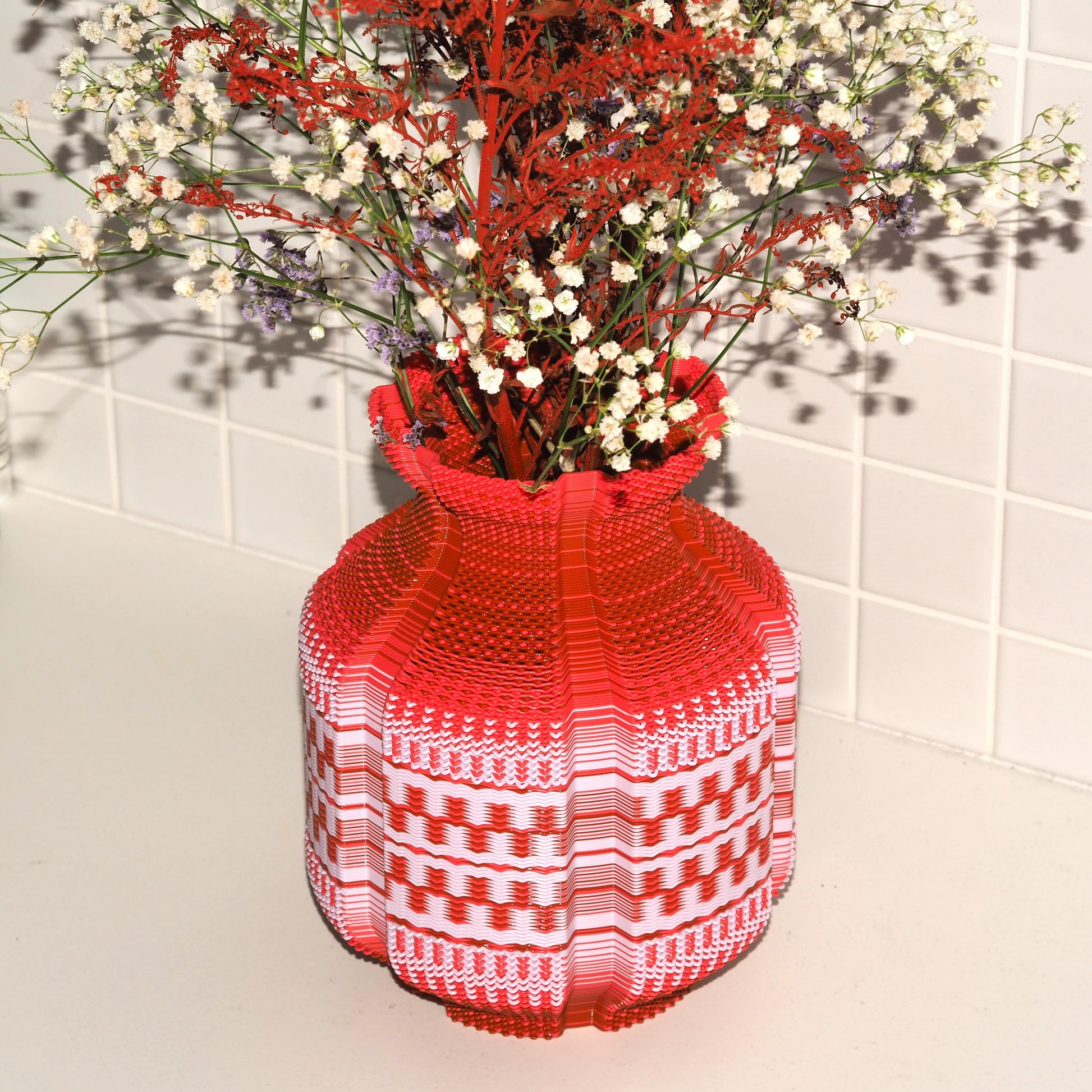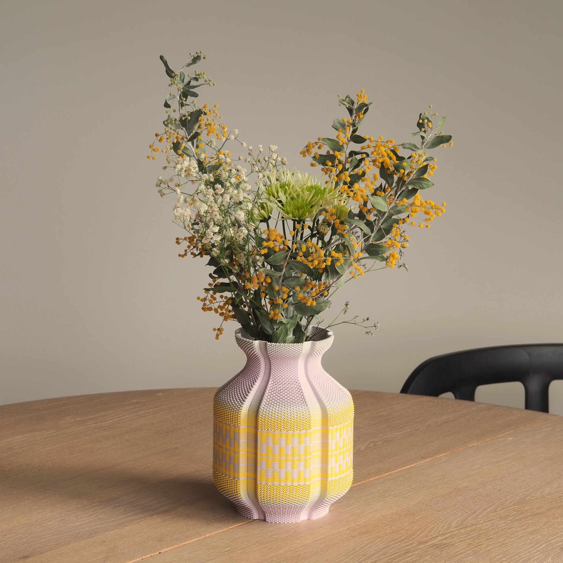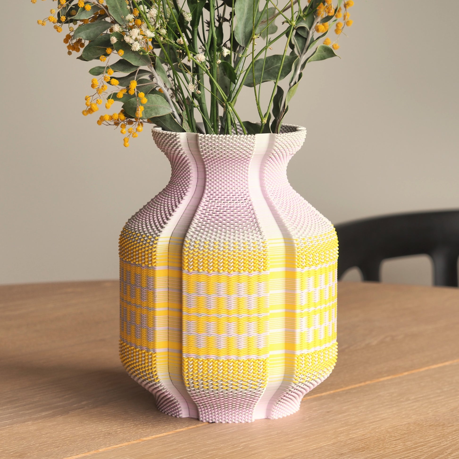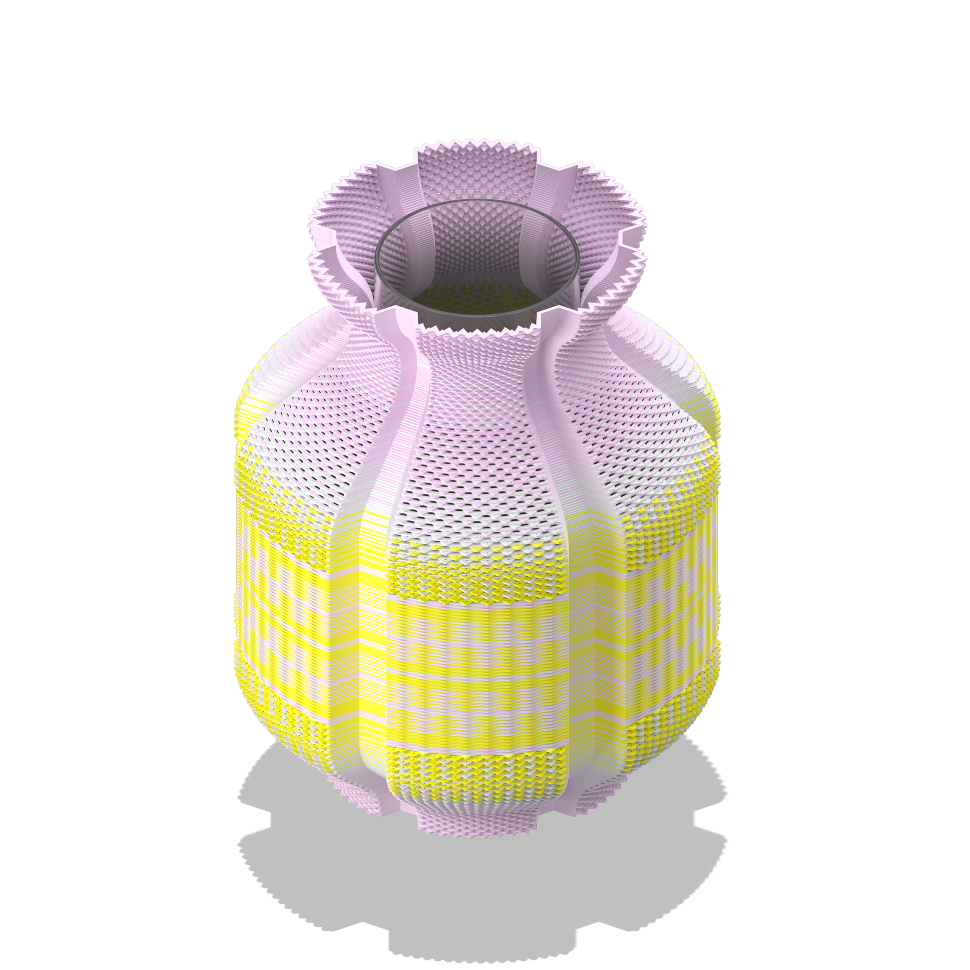 Vase made on a 3d printer using original technique of weaving. Made of PLA, bioplastic material with renewable resources. Glass insert inside.